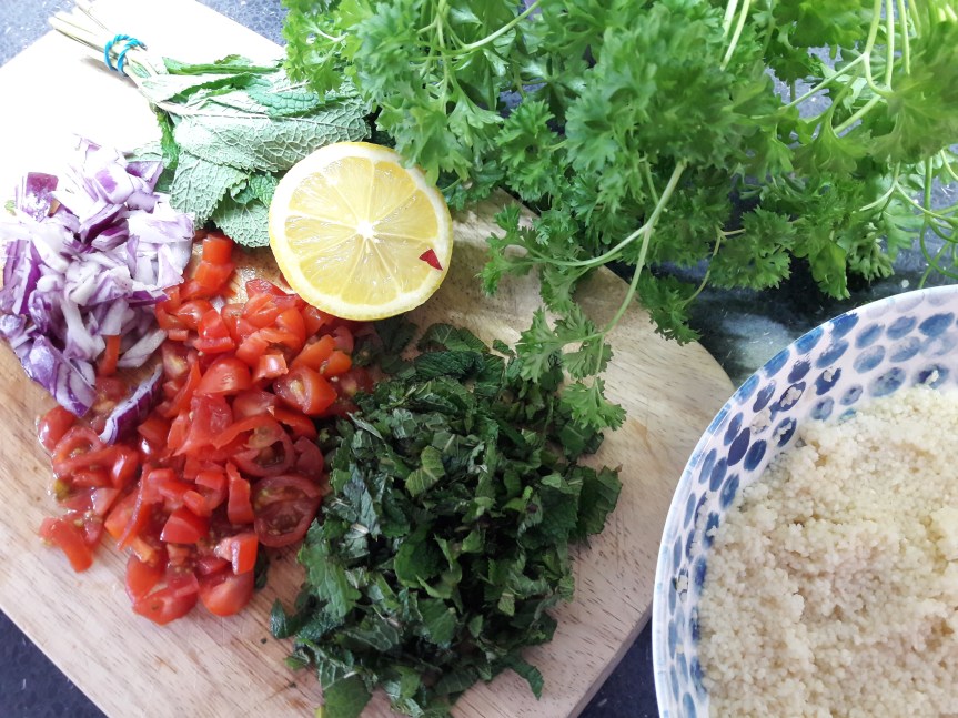 - While the couscous or bulgur wheat is soaking, prepare the rest of the ingredients. Dice the onion, quarter the tomatoes, finely chop the mint and parsley and squeeze the lemon.