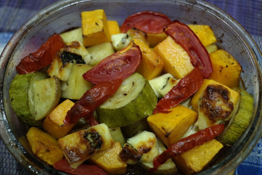 Those autumn hues – Roast butternut squash with courgette, halloumi and tomato