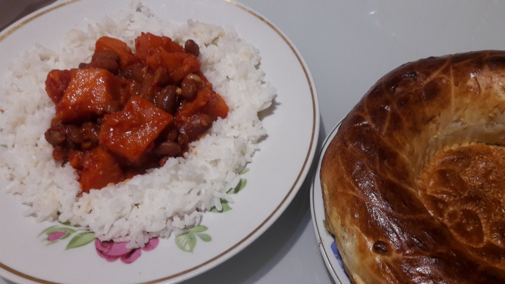 We had to opt for a bit of convenience this time as it’s hard cooking in a strange kitchen, so we bought a jar of a spicy tomato sauce called Cobra, and used ready cooked red beans. If you have more time on your hands, then substitute the Cobra with KCC’s very own spicy tomato sauce and soak some dried beans overnight.