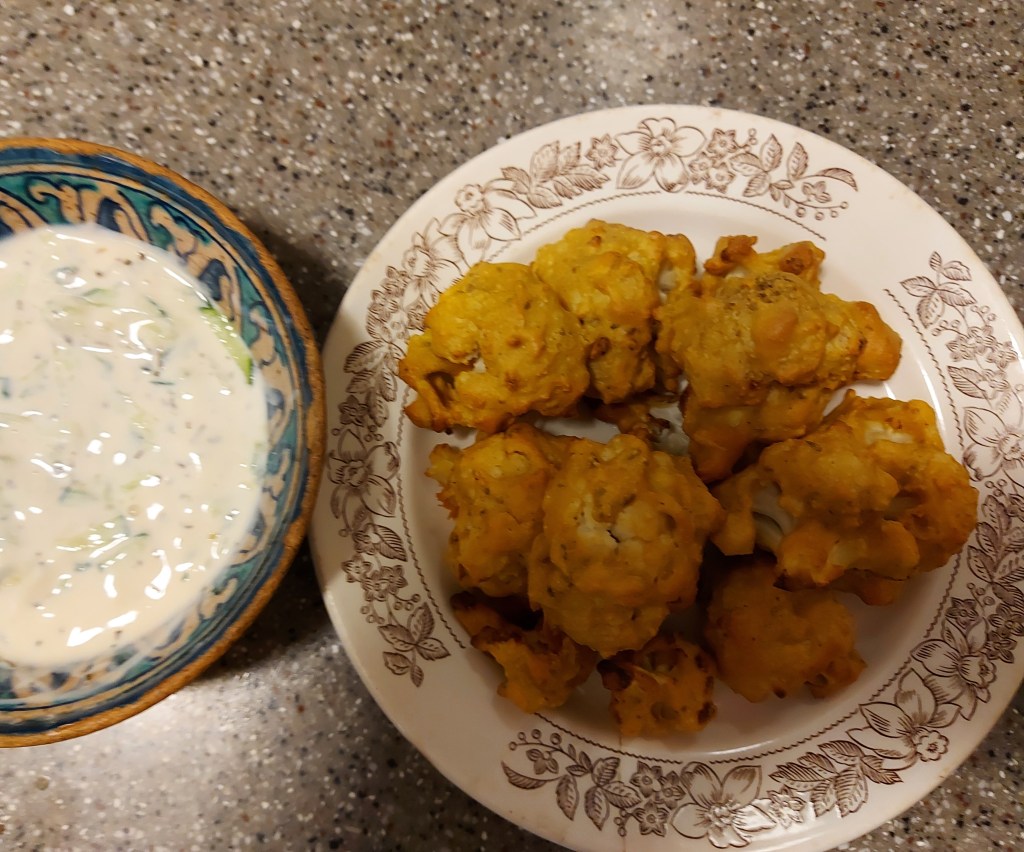 We’ve used cauliflower to make pakora this time round, but you can use onion, carrot, potato, peppers, mushrooms or combinations of more or less any vegetable you have handy. Paneer cheese (or halloumi) also works well with this versatile batter. We like to serve the pakora straight from the oven with a yogurt-based cucumber raita to dip them into.