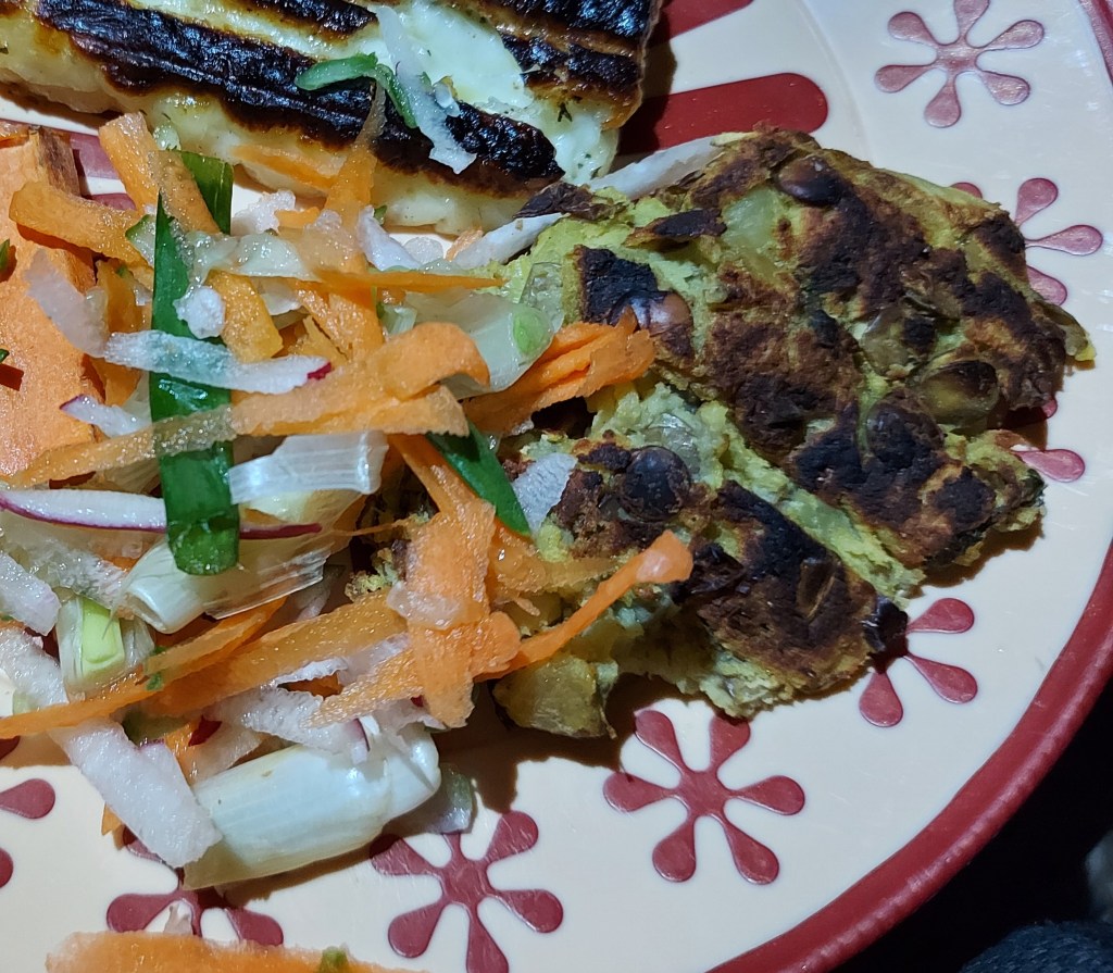 Bhaji burgers, halloumi and carrot slices on the grill