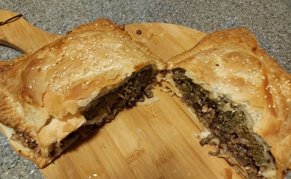 - Roll out the other piece of pastry, brush the 1 cm edge of the pie with olive oil and then place the larger piece of pastry over the top of the nut and pkhali mix and then crimp down the edges with a fork. Brush the pie with olive oil and bake in an oven heated to 180 c for 30 minutes or until the pie is a golden brown colour.