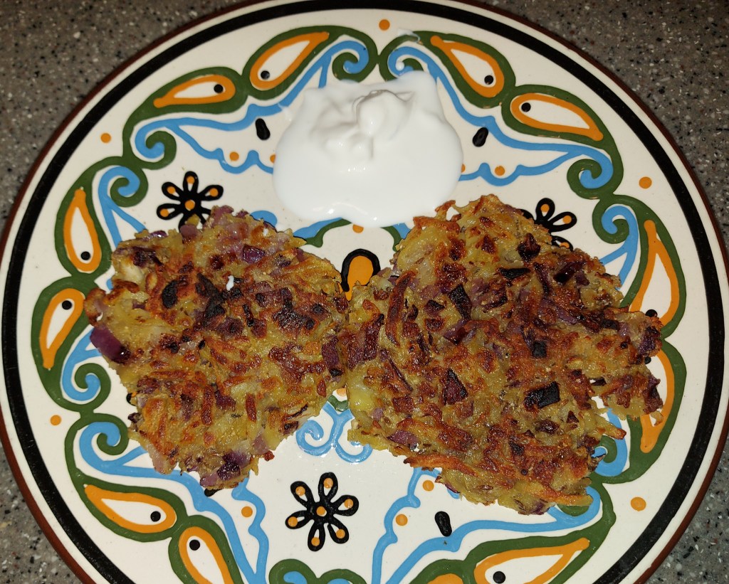 - Form the mix into eight golf ball sized pieces and fry in the oil over a medium heat. Flatten the balls with a fish slice and then flip them over and cook until golden brown on both sides. Serve with a dollop of sour cream.