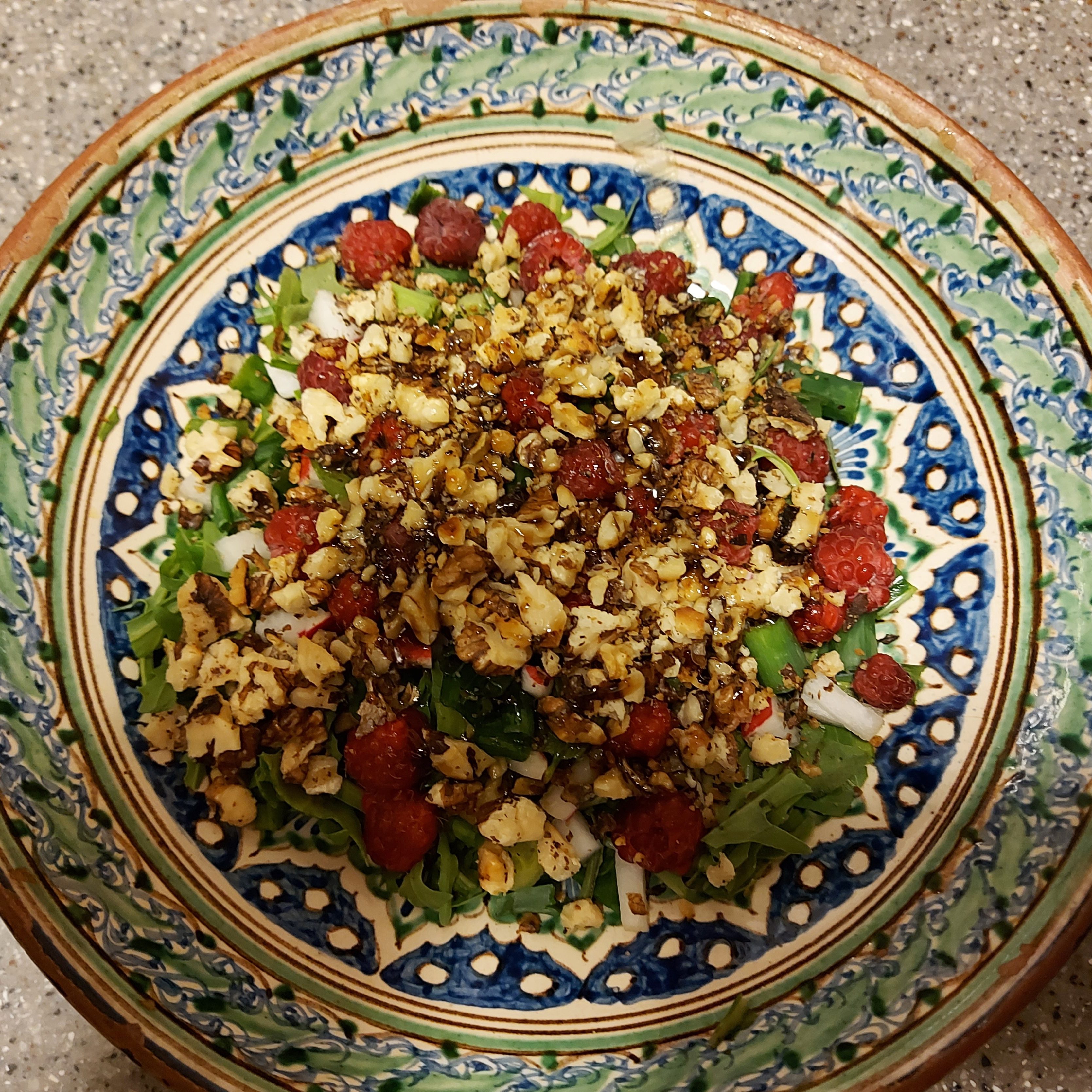 We popped along to see Gulzhaina, our local greengrocer in Almaty, but alas she only had raspberries in stock. Not to worry, though, as these tart berries are also great when used in a salad.