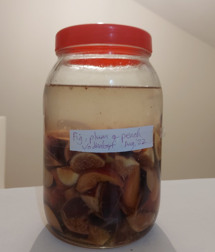 To make the fig vodka, wash and quarter 0.5 kilo of figs and put them in a steriised one litre glass jar. Pour vodka to cover the figs, put the lid on and leave in a cool, dark place for a few months before drinking. Here’s our latest batch with peach and plum added.