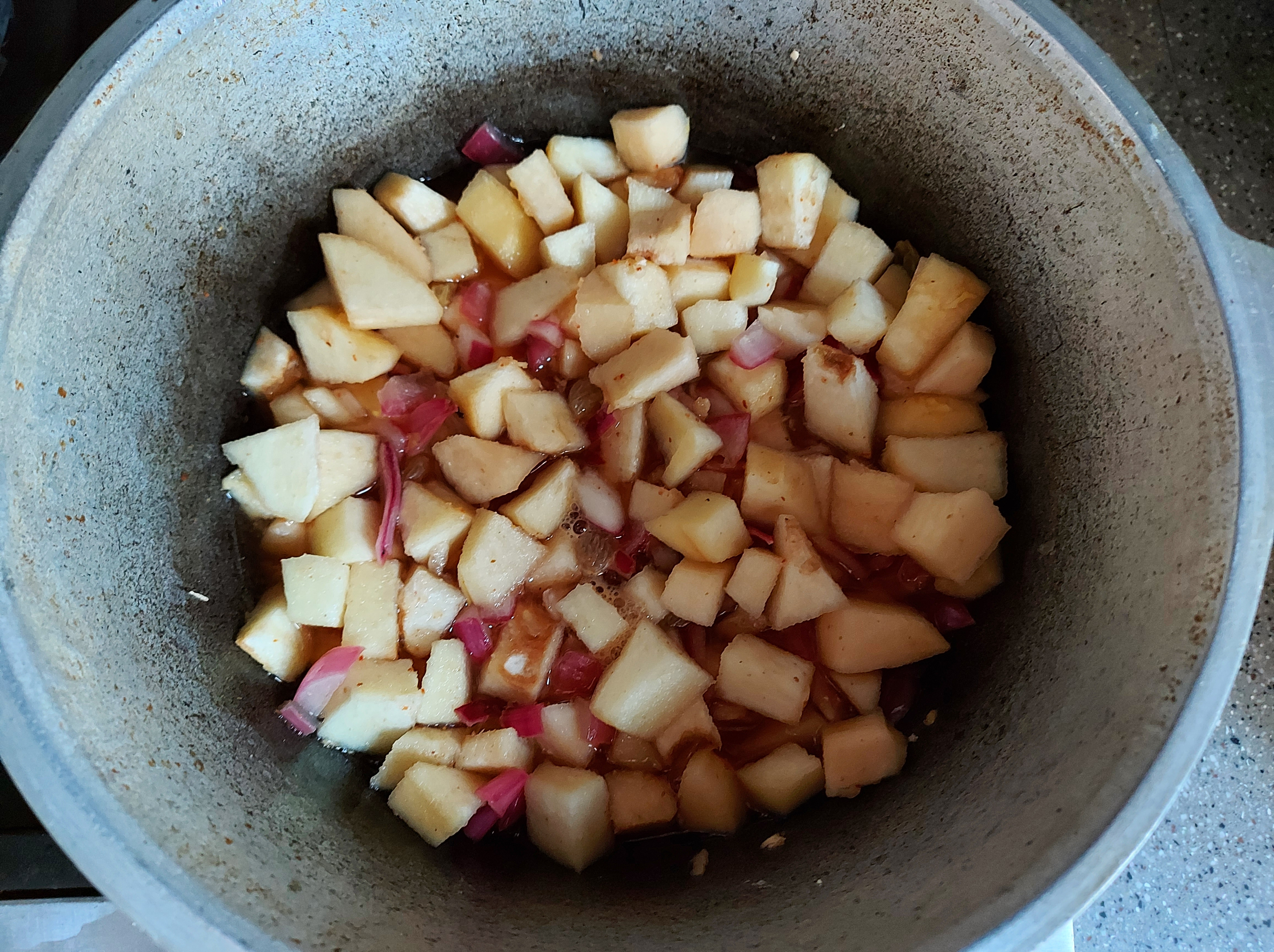 - Put all the ingredients in a heavy-based pan. Bring to a boil and then simmer over a low heat, stirring regularly, for at least one and a half hours – it should thicken up into an amber-coloured mass.