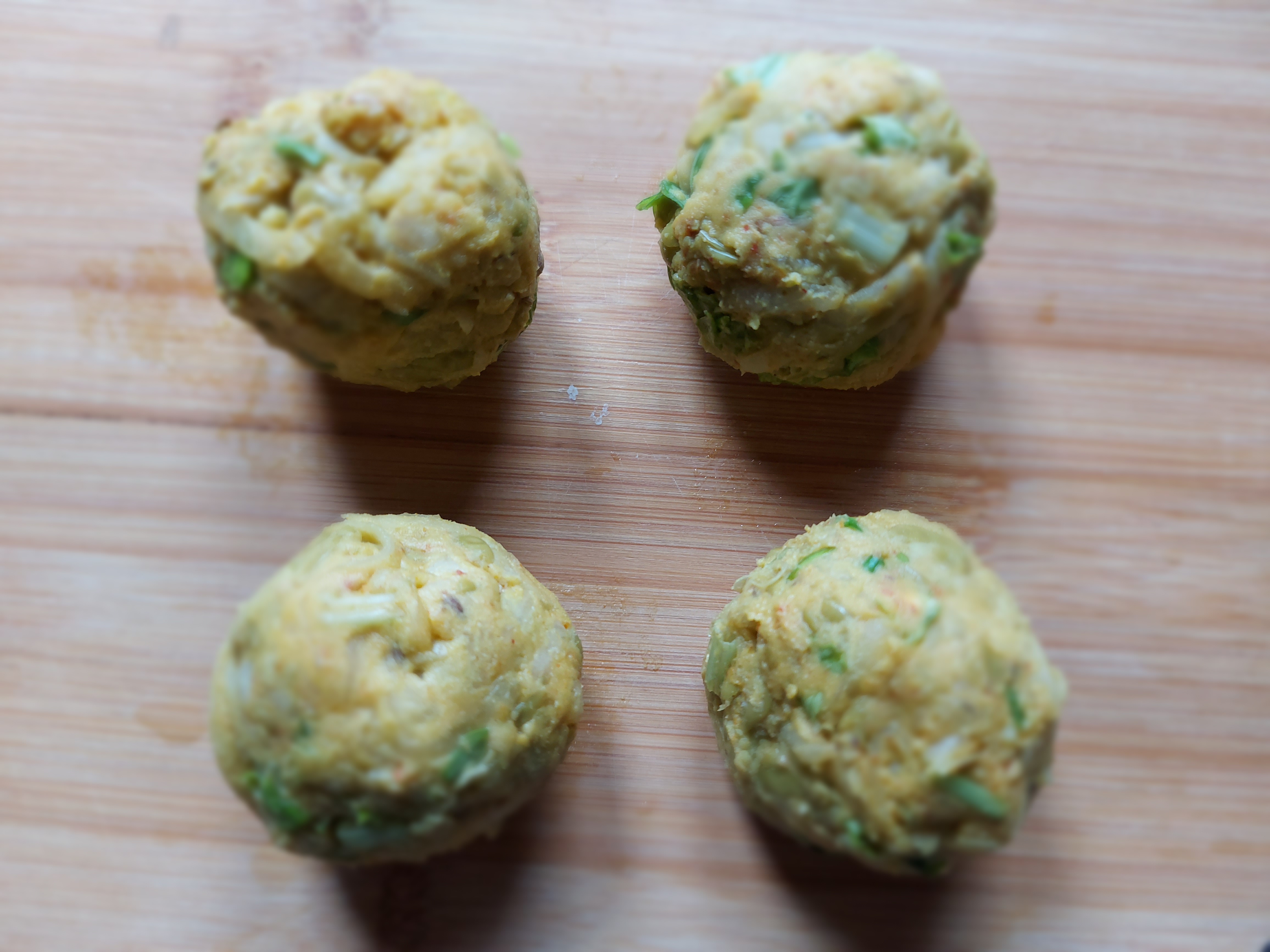 - Peel and grate the mooli into thin strips. Squeeze the moisture from the grated mooli. Chop the celery stalk and leaves finely and put into a bowl with the grated mooli. Add the peas and the spices and mix well. Now add the chickpea flour and blend everything together. The mix should be sticky but not wet – if it’s too moist, then add a bit more flour until you get a sticky consistency.
