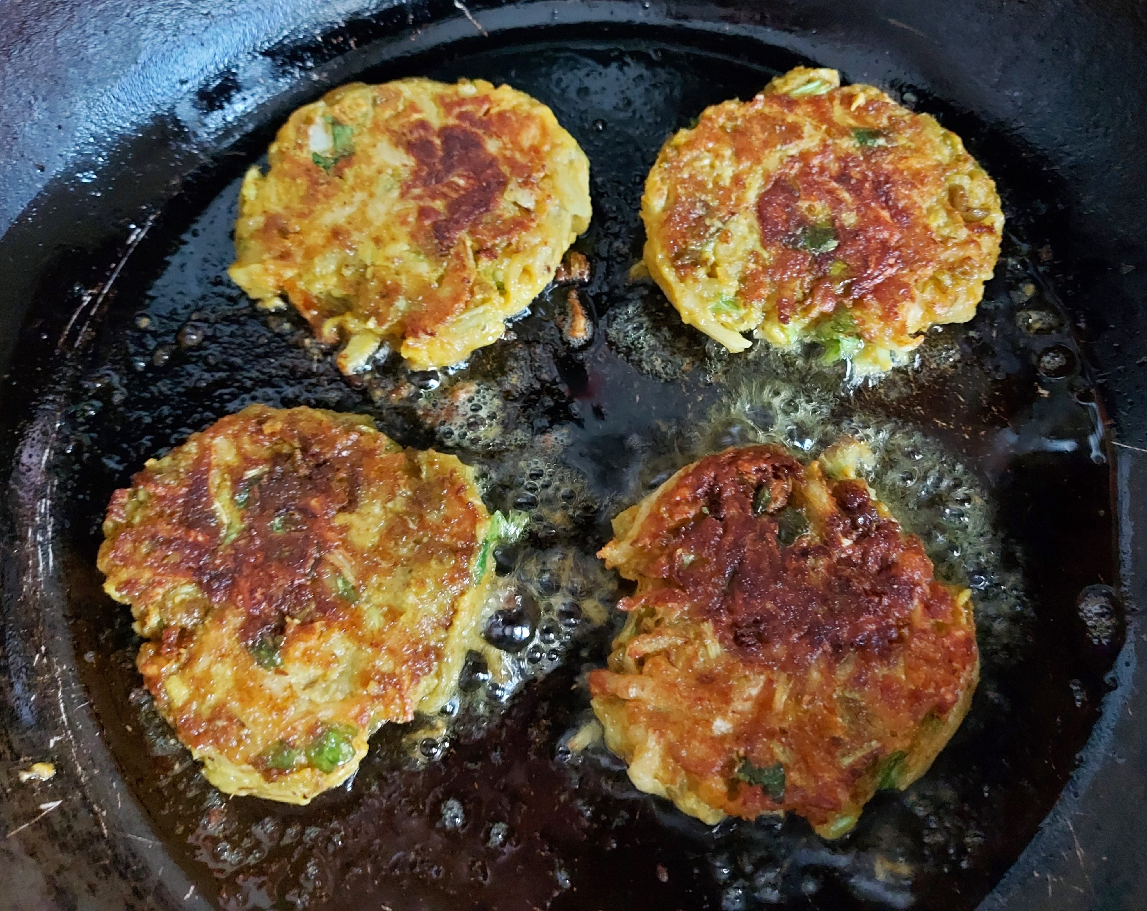 - Heat the oil in a frying pan. Form the mix into four golf ball-sized pieces. Place in the pan and flatten with a fish slice. Turn the fritters over after frying for two to three minutes. Cook for another two to three minutes until both sides are a golden brown colour. Serve in a burger bun or in a baguette. Top with grated carrot and red cabbage and shredded lettuce or rocket, add a splash of soy sauce and enjoy!