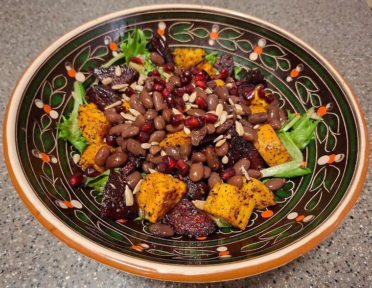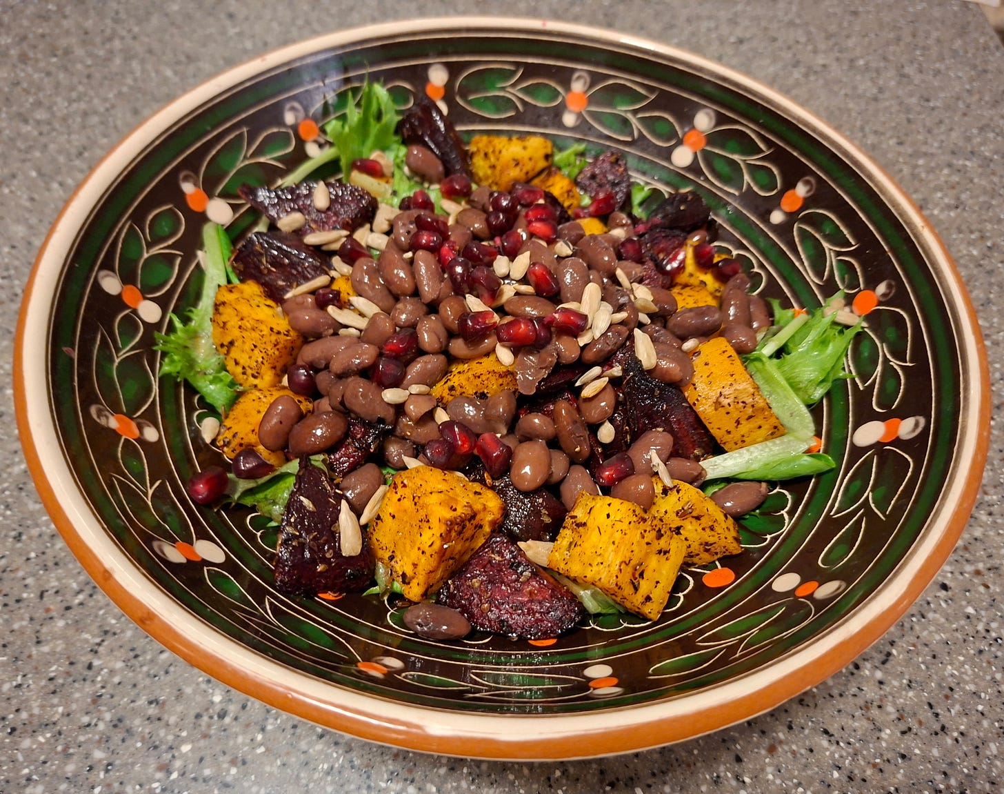 Put the mixed salad leaves in a bowl and add the roasted sweet potato and beetroot. Add the cooked red beans and then sprinkle the sunflower and pomegranate seeds over tha salad.Make the dressing by combining 20 ml tahini with 10 ml olive oil, 10 ml apple vinegar and 10 ml pomegranate syrup in a small bowl. Whisk with a fork and add water to bring the dressing to a pourable consistency.