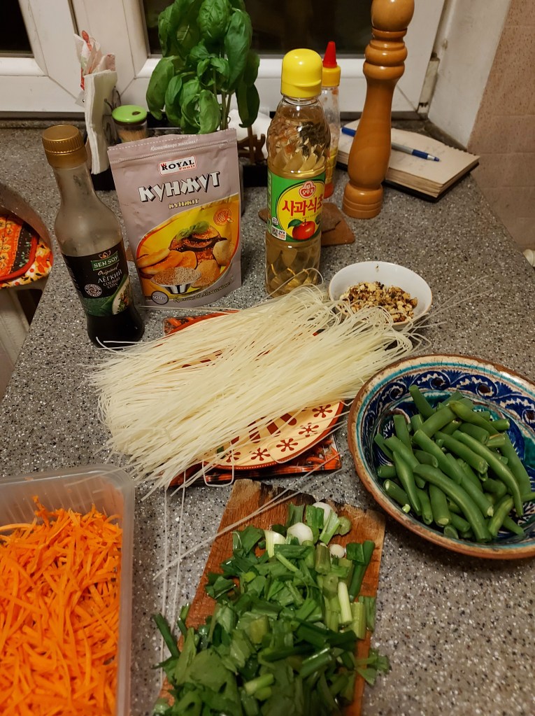 Continuing with our summery vibe, the year’s first green bean crops are appearing. Green beans are great for adding a bit of crunch to a stir fry or a salad, we’ve gone for the best of both worlds by mixing our green beans in with celery, carrots, spring onions and walnuts on a bed of funchoza (vermicelli) noodles, liberally dressed with soy sauce, apple vinegar and sesame seeds.