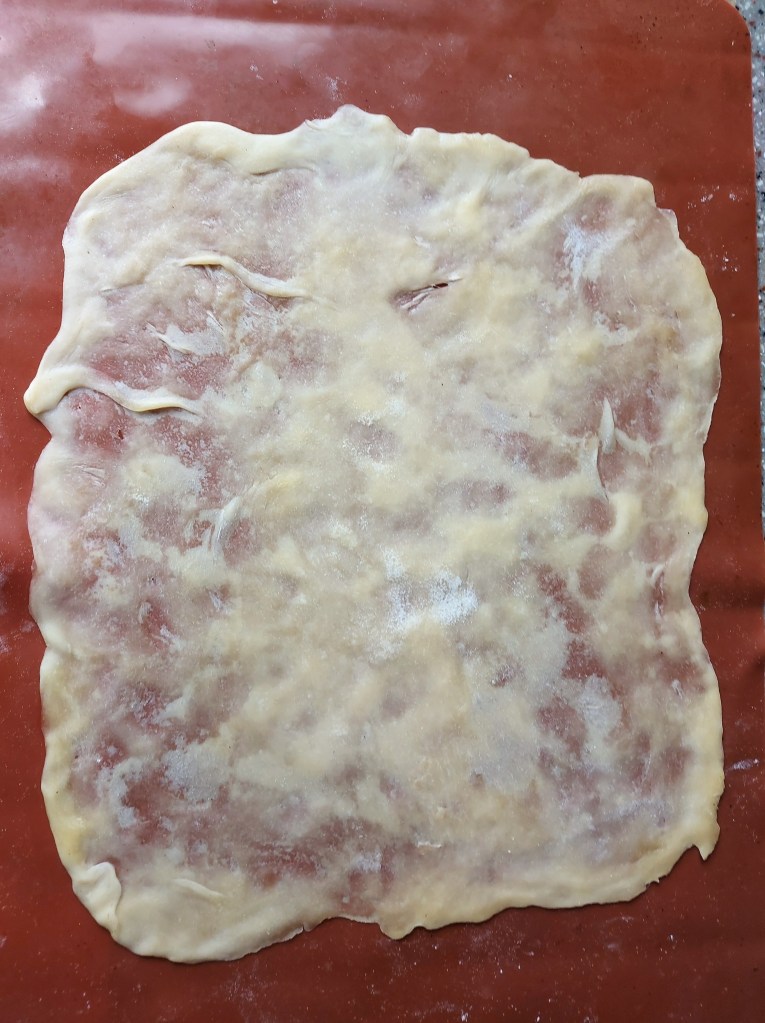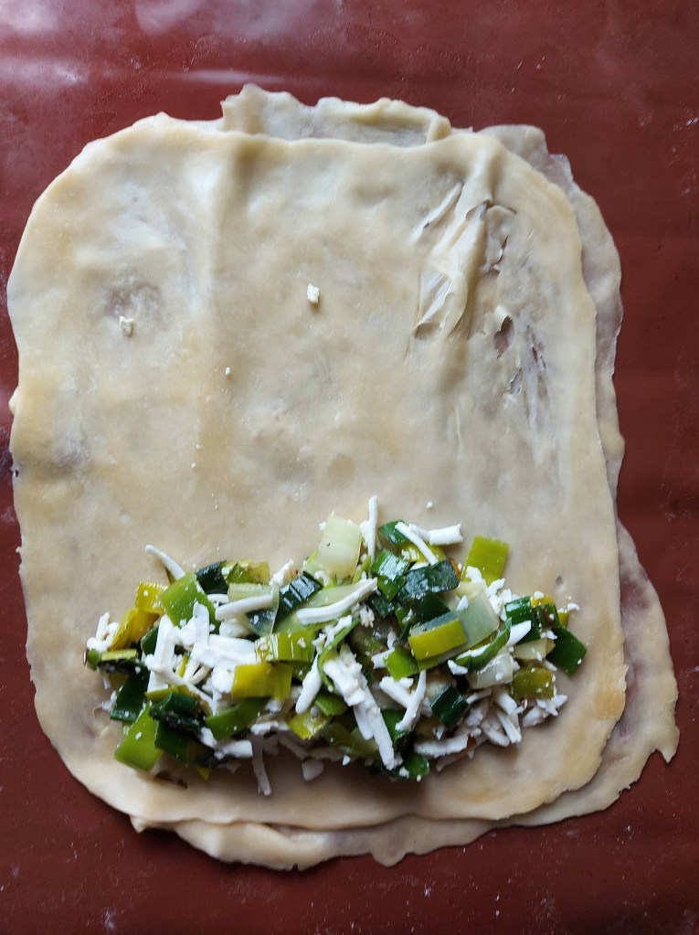 - To assemble the pie, cut the pastry into two rectangles, one slightly smaller than the other. roll out the smaller piece and top with the nut roast mix, leaving 1 cm around the edges. Put a layer of spinach pkhali on top of the nut mix.