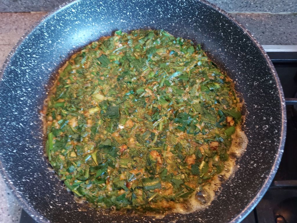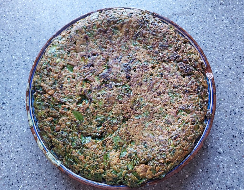 - Crush and then toast the walnuts (without oil) for 10 minutes in a 12 cm frying pan. Remove the walnuts and mix them in with the herbs and eggs. Put half the olive oil in the frying pan and heat it up and then add the herb mixture, flattening it with a spatula.